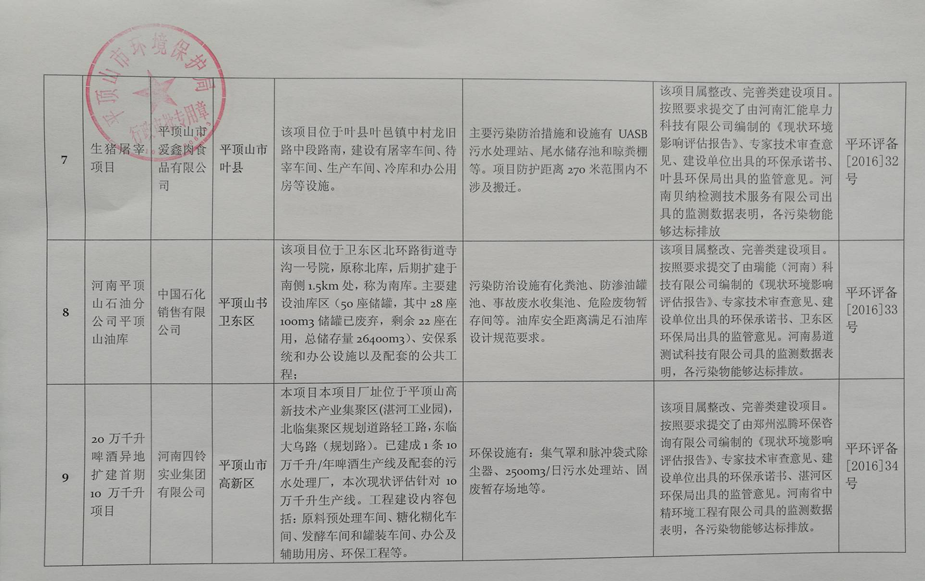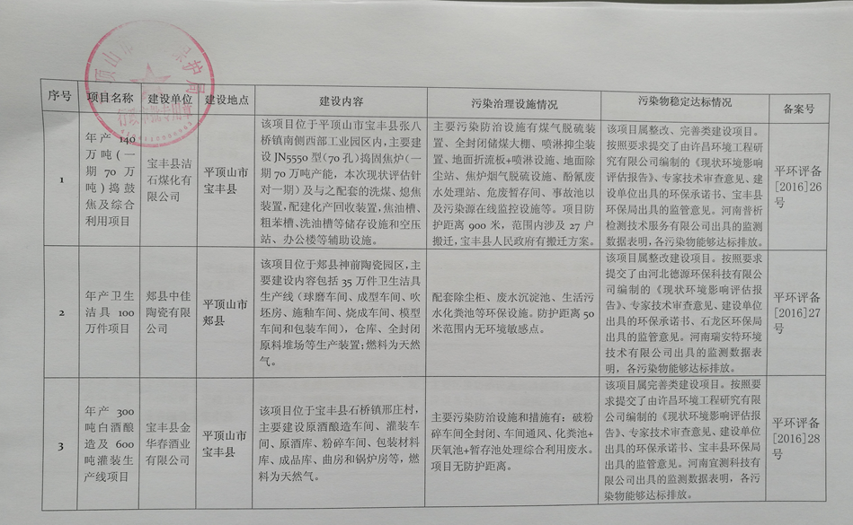 按照《河南省人民政府办公厅关于清理整改环保违法违规建设项目的通知》(豫政办明电〔2016〕33号)和《河南省环境保护委员会办公室关于做好清理整改环保违法违规建设项目的实施意见》(豫环委办〔2016〕22号)要求,下列11个建设项目经环评机构编制的《现状环境影响评估报告》评估,专家技术审查,项目辖区环保局出具的监管意见,经平顶山市环境保护局集体讨论决定,在平顶山市环境保护局网站进行了环保备案前公示,经公示无异议,现对下列建设项目进行环保备案并公告。