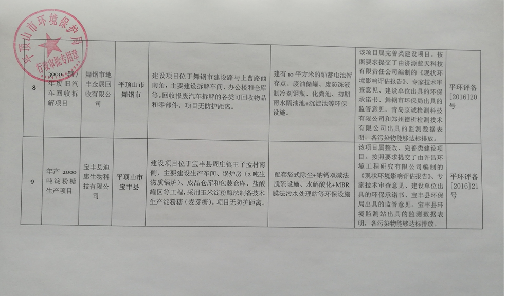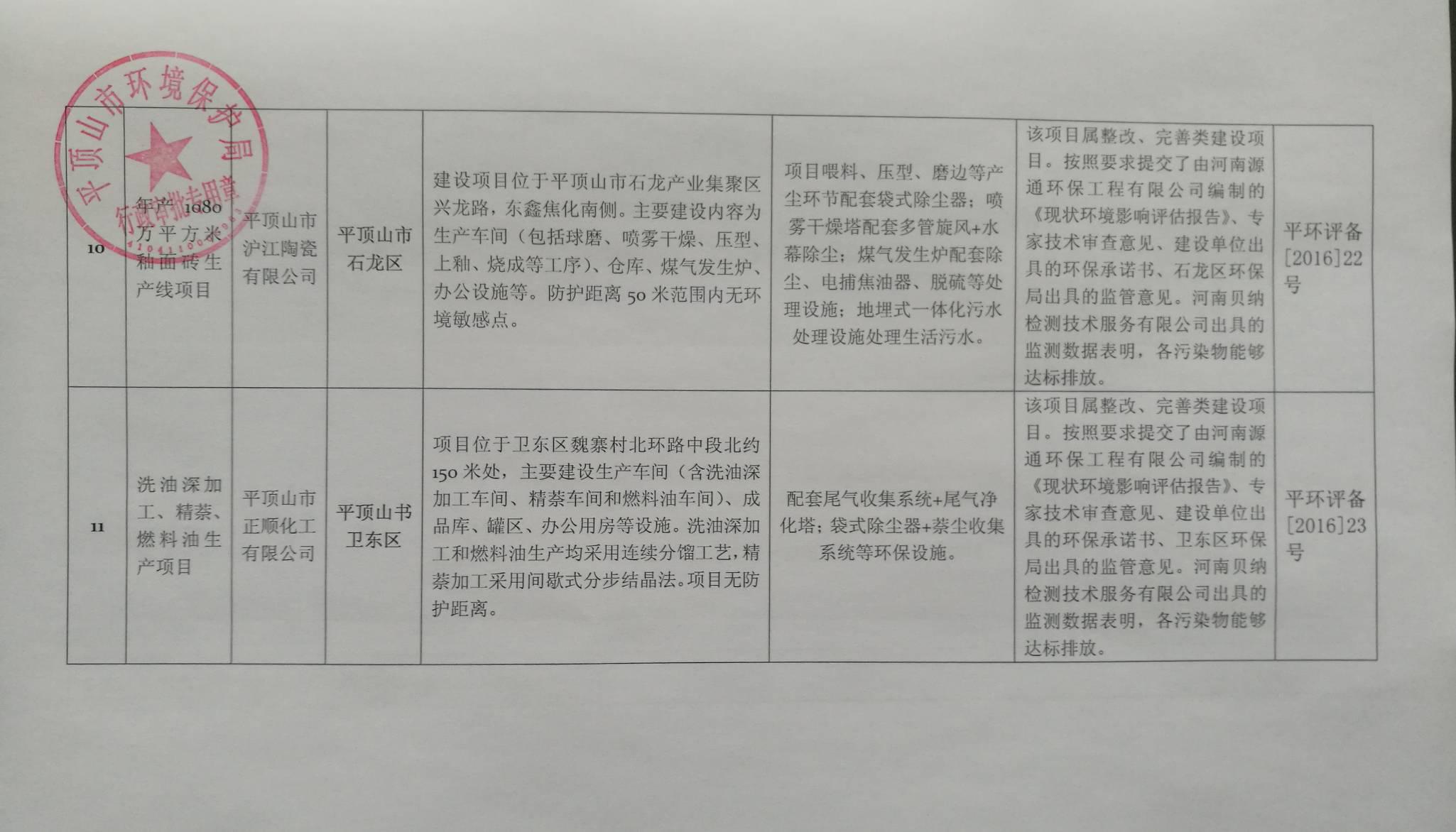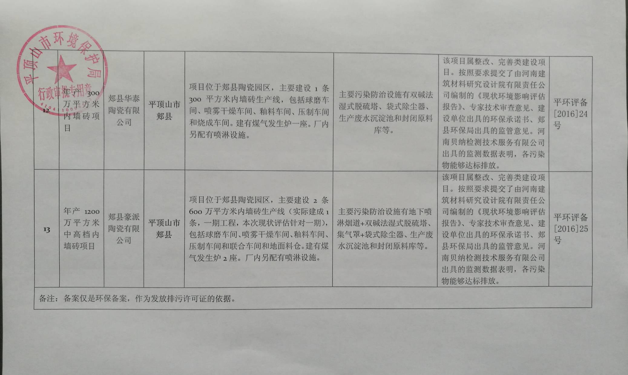 按照《河南省人民政府办公厅关于清理整改环保违法违规建设项目的通知》(豫政办明电〔2016〕33号)和《河南省环境保护委员会办公室关于做好清理整改环保违法违规建设项目的实施意见》(豫环委办〔2016〕22号)要求,根据环评机构编制的《现状环境影响评估报告》,专家技术审查意见,项目辖区环保局出具的环境监管意见,平顶山市环保部门集体讨论决定,现对下列13个建设项目进行环保备案前公示,公示期为:2016年11月15日至2016年11月21日,如有异议,请自本公示发布之日起5日内反馈我局环评科 。联系电话:3990310,联系人:谈昌发。