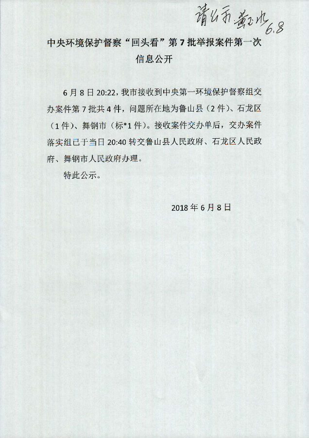 6月8日20:22,我市接收到中央第一环境保护督察组交办案件第7批共4件,问题所在地为鲁山县(2件)、石龙区(1件)、舞钢市(标*1件)。接收案件交办单后,交办案件落实组已于当日20:40转交鲁山县人民政府、石龙区人民政府、舞钢市人民政府办理。